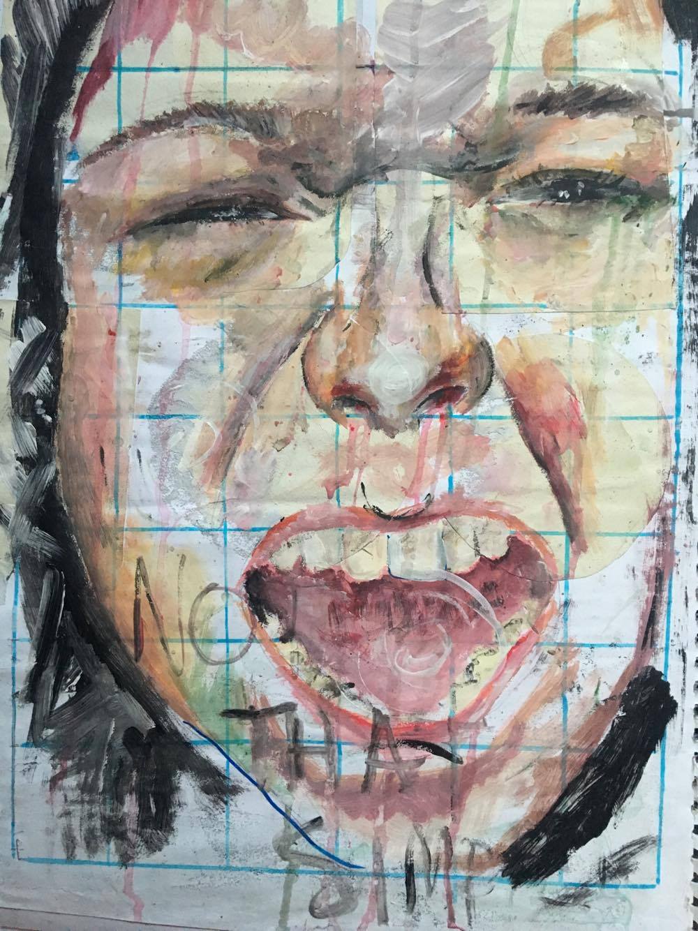 The process I go through when painting usually begins with research, I look through social media to find what the current controversy is. I then think of ways to incorporate that into portraiture. For example, the Women’s March in America earlier this year inspired me to paint Trump’s face with the words “pussy grabs back”; it was my favourite response to Trump’s sexism. After I’ve decided what to paint, I use acrylic and a tiny paint brush and I take to the canvas. I use short scribbling motions to apply the paint and layer different colours to blend them together. I don’t blend the colours fully because I like the patchy collage look it gives. Normally I sit listening to funky music with a coffee in hand (milk and three sugars).