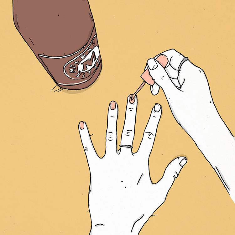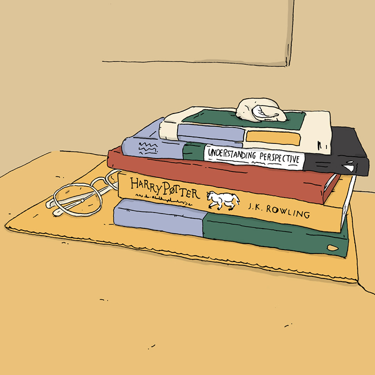 When I have an hour or so free, I pick something off the list and draw my little story out. I always hand draw with pens first, then scan them into my computer, and colour them in Photoshop, and then add a texture to the white layers, because pure whites give me anxiety.