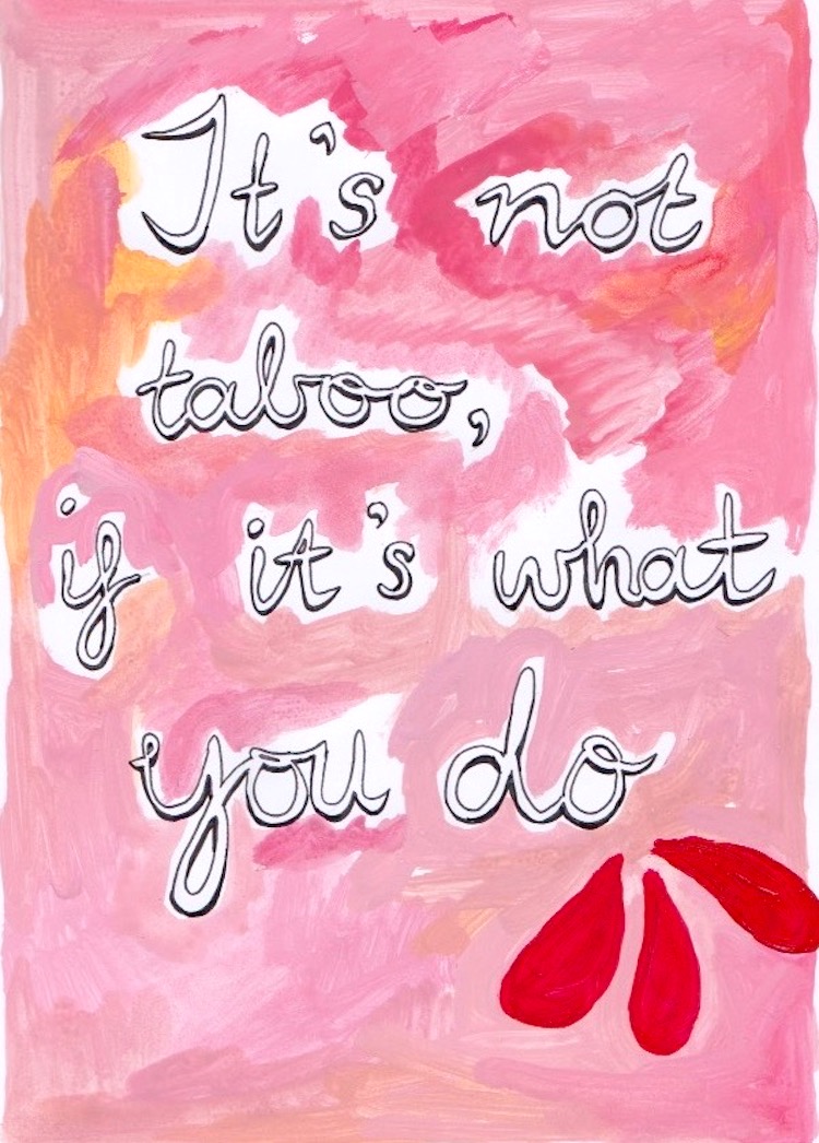 I was inspired to create this series because of my passion for and interest in women’s health and women’s issues. Growing up, I really hated my period — I was pretty young when I had my first period (11 years old) and mortified! But then I grew to love everything about it, like blood as a symbol of health and fertility, and the whole body synchronizing monthly patterns that occur over the course of a month or so. I’m also really inspired by the technology that has recently revolutionised hygiene for individuals who get their period, like period undies (such as Thinx and ModiBodi) and menstrual cups. So, I wanted to create some text-based slogans that would shine a more positive light on menstruation. A lot of the phrases used are from conversations between my friends and I, who have all had similar experiences that I think most people who get their period can relate too.