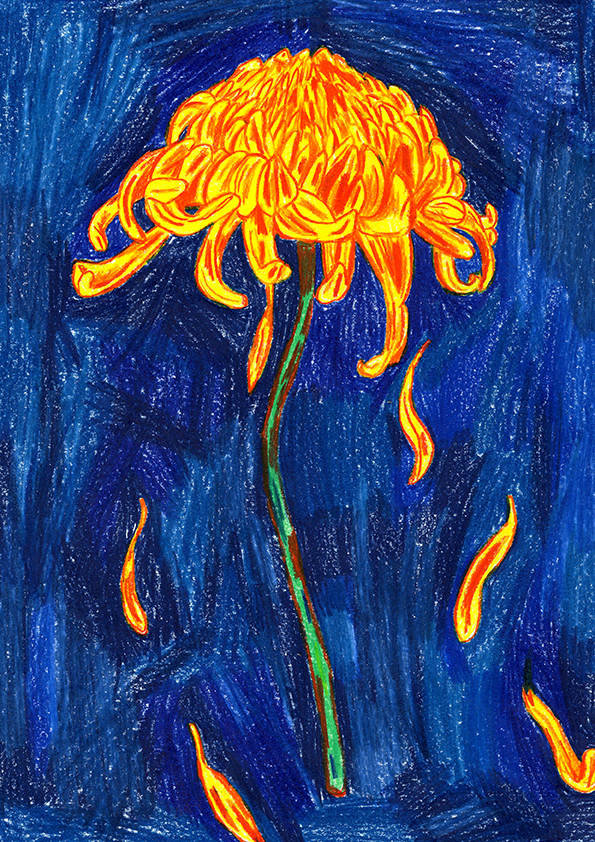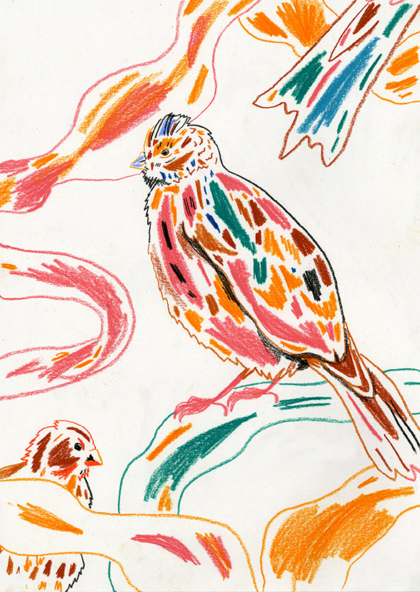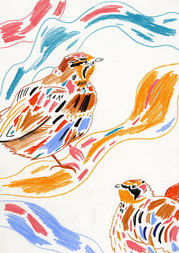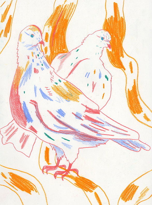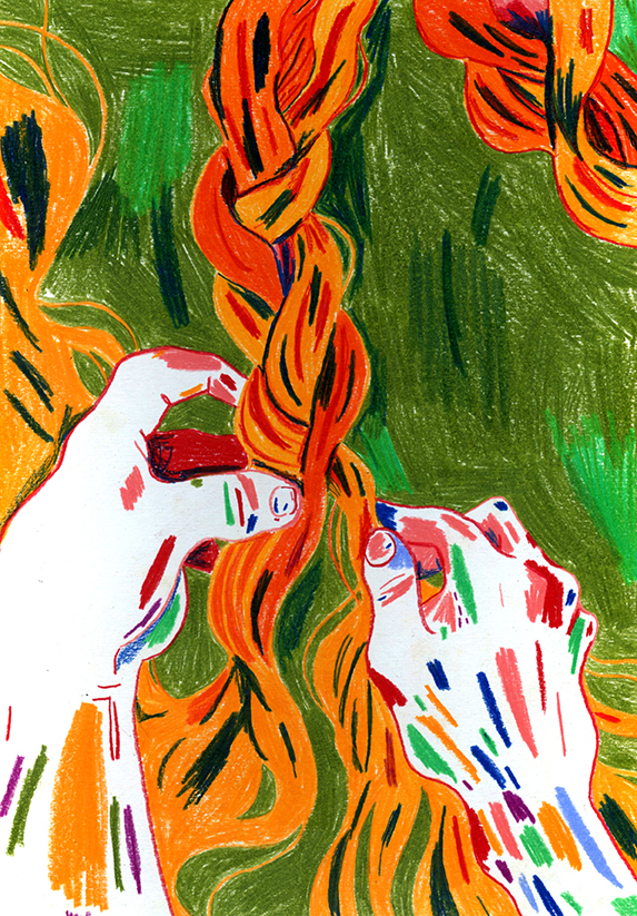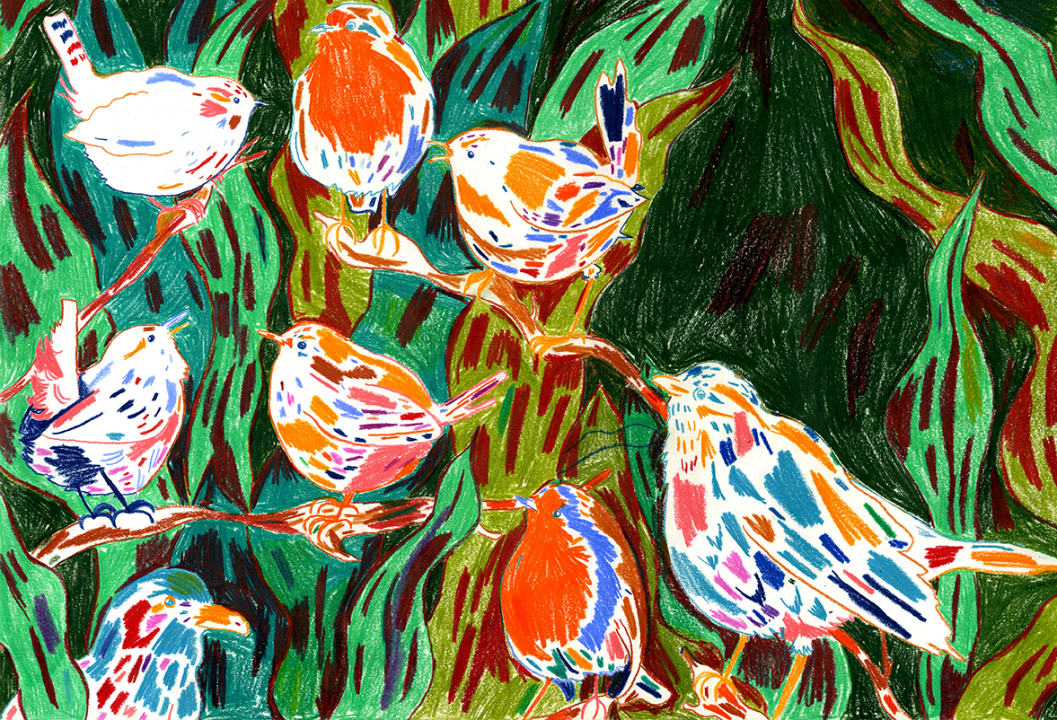 It depends on what medium or project I’m working on. Usually, I make a few roughs in pencil, decide which composition I like best, and work from there. Occasionally, I’ll debate whether the composition would work best in coloured pencil or digitally, but usually I have a vague idea in my head of which medium I want to use. If I’m working traditionally, sometimes I limit my colour palette and use only a few of my coloured pencils or try using a whole spectrum of colour. With my digital work, I tend to draw with mechanical pencil, scan the drawing in and then play around with the colour and lines in Photoshop.