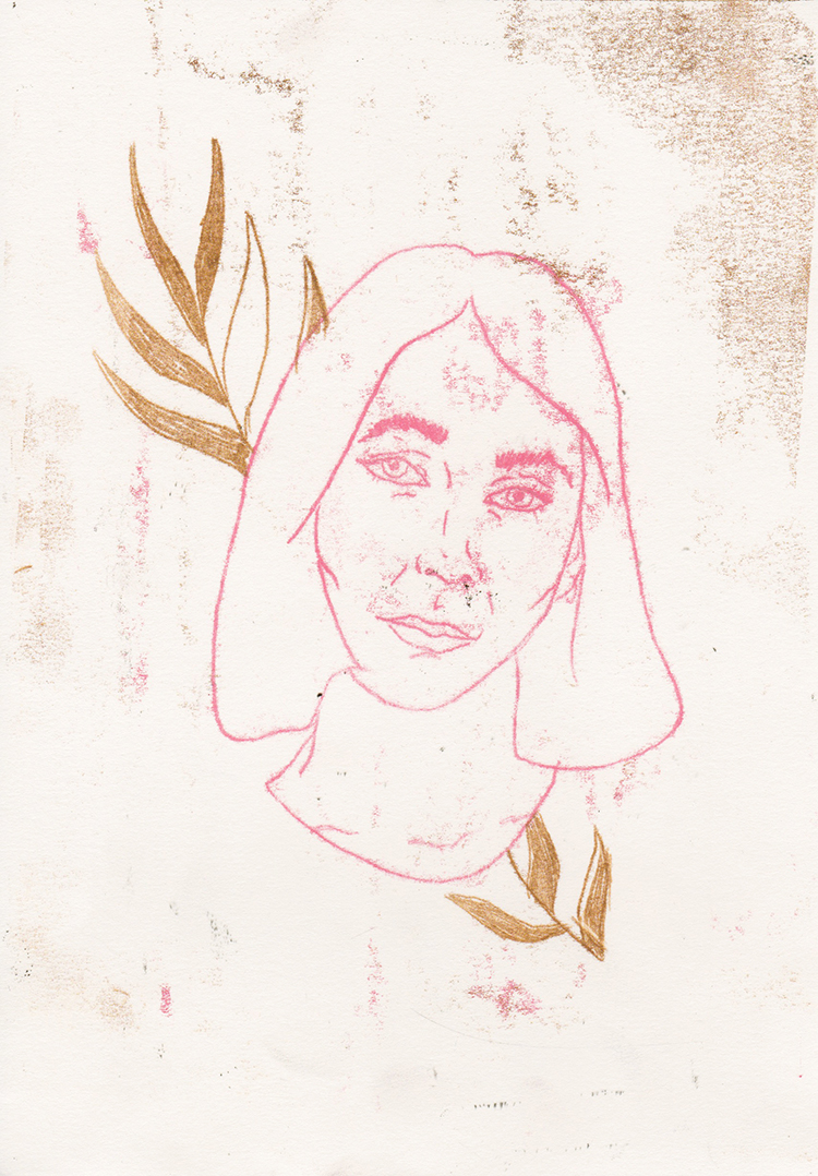 I tend to use more earthy, natural tones, alongside textures created using relief print, which I feel adds a slight nostalgia to my work. I like using subtle symbolism; for example, in the portrait of Florence Welch, I added roses and thorns around her to symbolise balance, of loss and new beginnings, but also the shape in which they sit around her head, is a bit halo-like to show my personal adoration of her. Her hair is shaped like water, to represent both purity and chaos. In my work, the portraits especially, everything is placed for a reason, so I like to think they almost hold a narrative within.