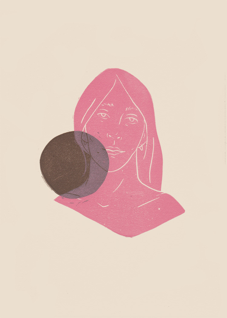 Normally I start by scribbling in my sketchbook any initial ideas; from there I’ll do some monoprinting. I find monoprinting allows me to not think so much and just ‘do’, so I often get some really random ‘accidents’ that end up taking my work in an unknown or unexplored area I wouldn’t have initially thought of. From there, I’ll draw up final pieces, separating different layers with different colouring pencils to transfer onto lino blocks. Often my final outcomes will be in relief print, sometimes tweaking or colouring digitally.