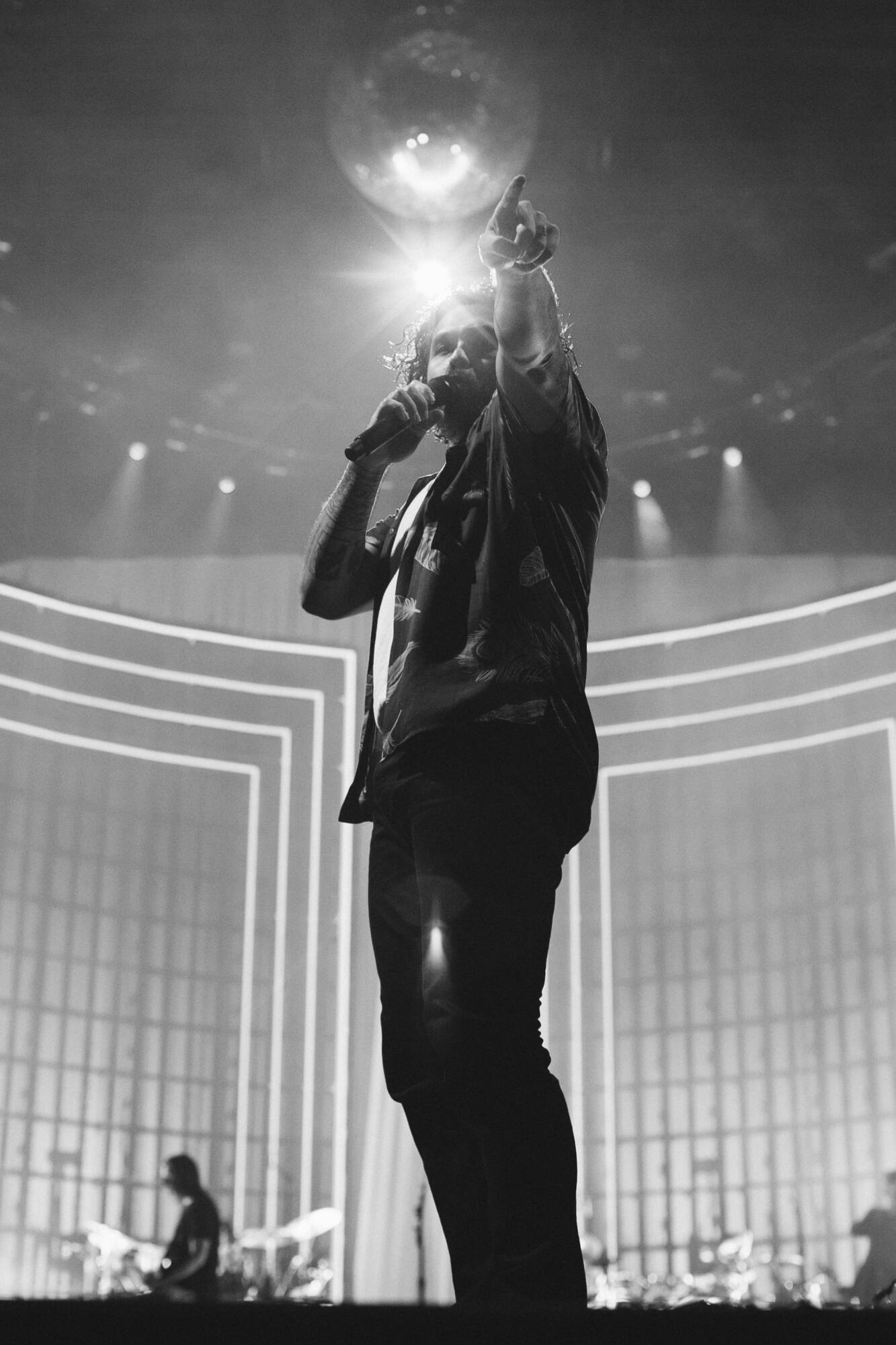 The seemingly forgettable big show moments continue when the band regularly interrupts the set to ask about the football score – answers seem to fly from all sides of the arena. Sport ends up being an integral theme. The last two tracks on the record, Hand of God and Goal Of The Century are named in honour of Diego Maradona’s goals in the 1968 FIFA World Cup Semifinal. The latter song name-checks Australian Formula 1 driver Daniel Ricciardo who is credited as a percussionist on the record. And as we stood in one of the more recognisable tennis arenas in the world, one person had the genius idea to hold up his phone in GA so that everyone could watch the AFL game happening across the road. Like I said, mundane magic.