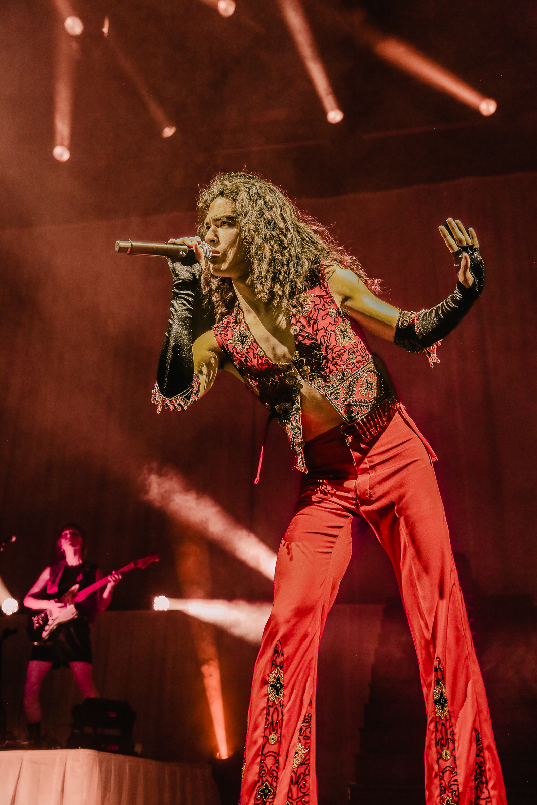 Finally, the lights dimmed, and a roar immediately filled the arena. As his band members got in position and the curtains were opened, the sight of Conan Gray standing atop the stage sent the crown into a euphoria. Standing in gold boots and a red and gold outfit to match, the wait was worth it.