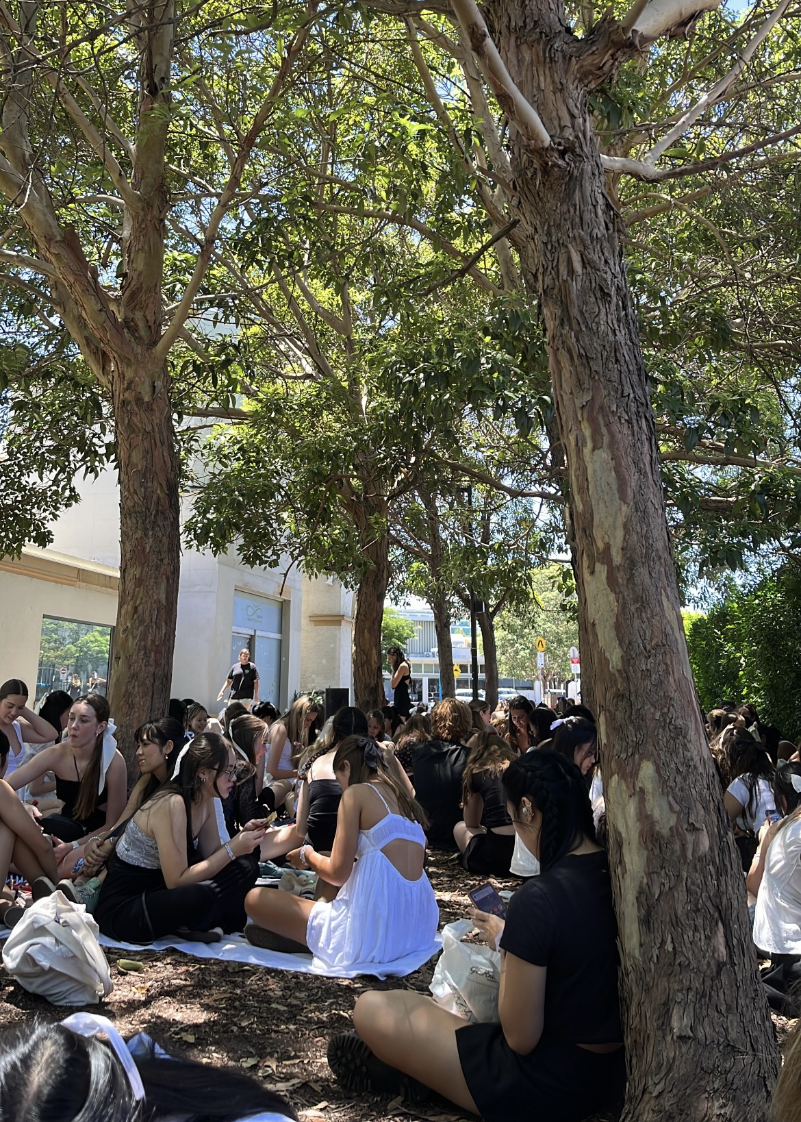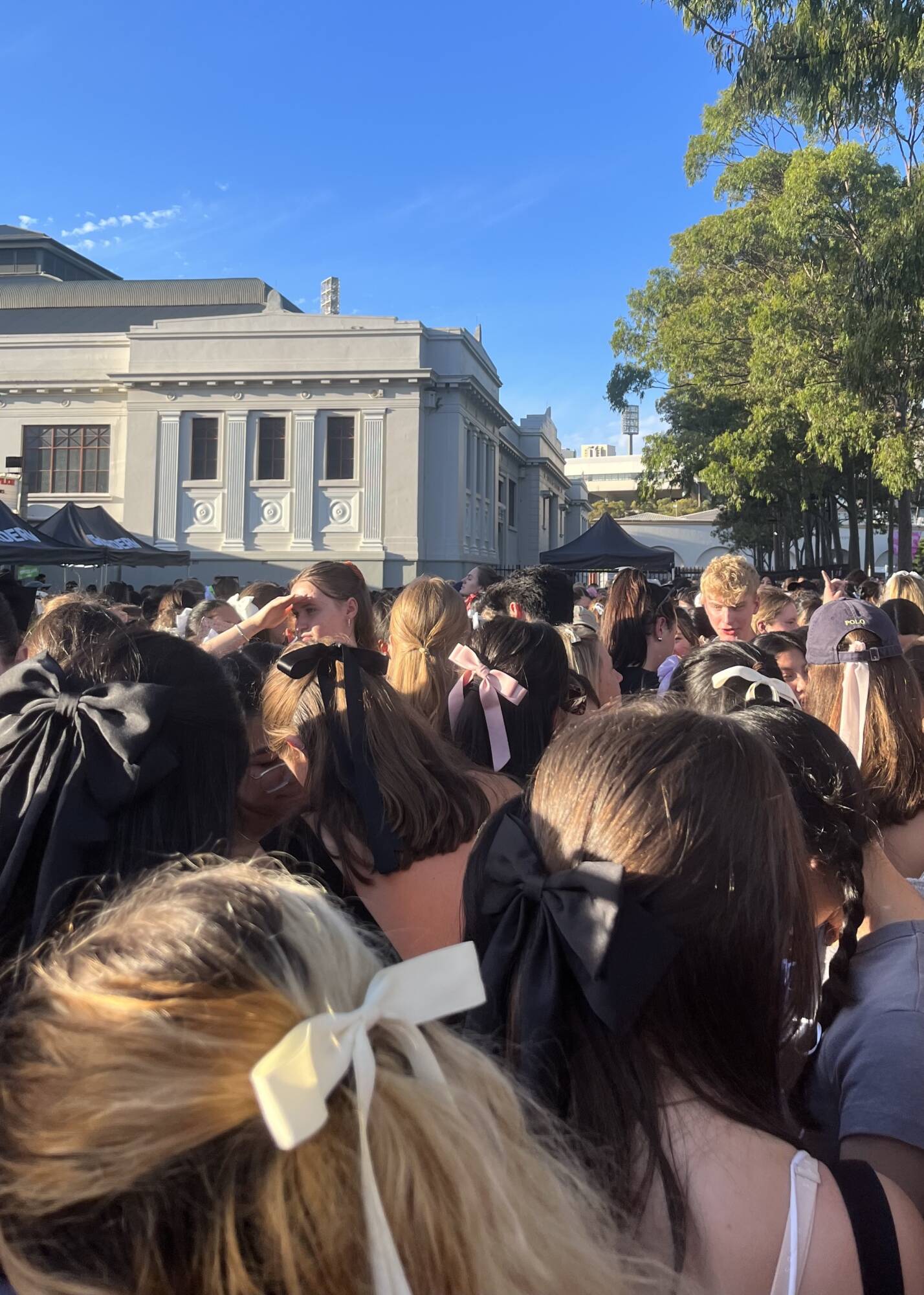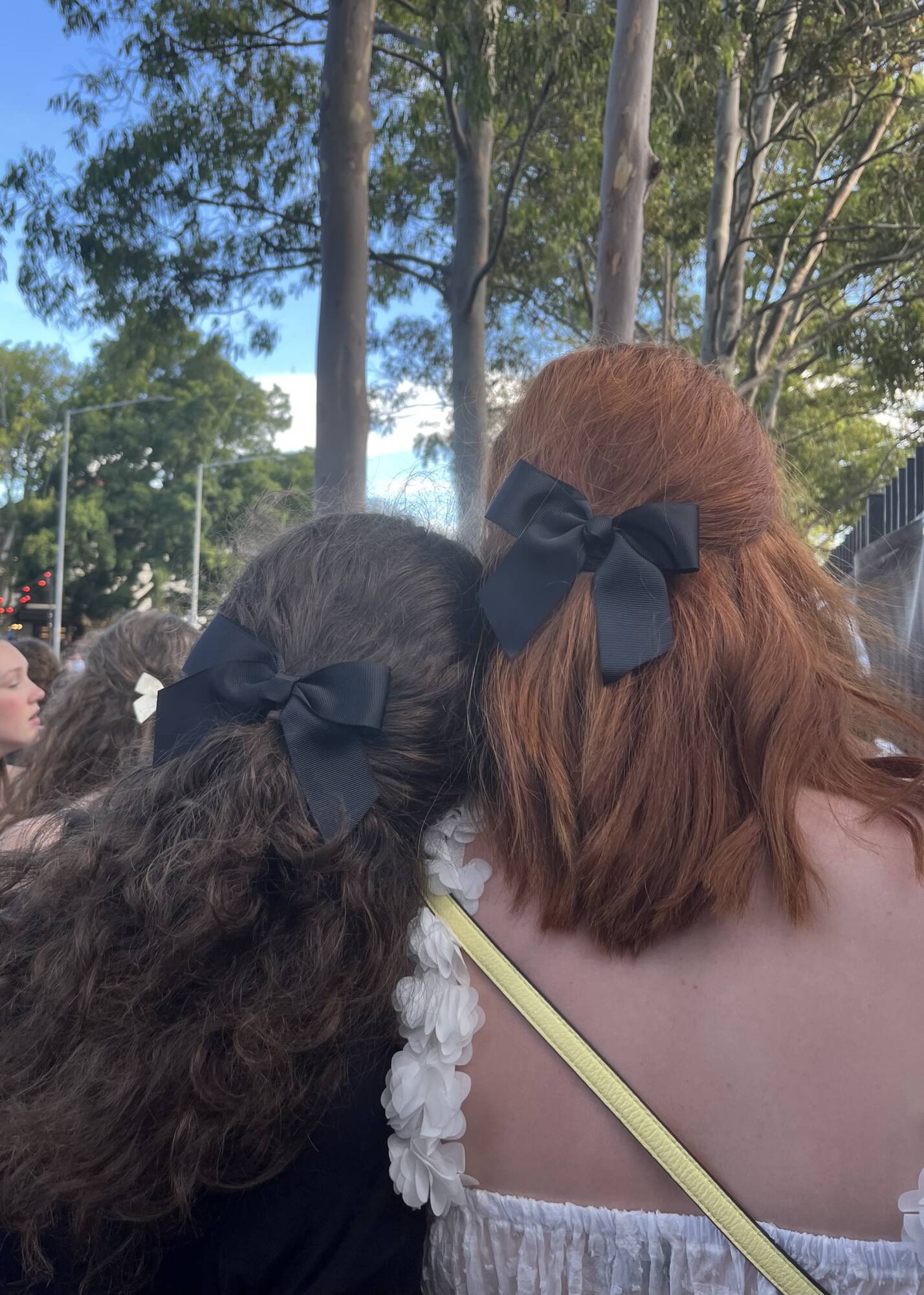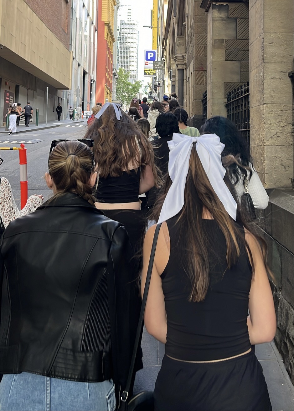As soon as we landed and checked into our hotel, I pulled two dollar-store black bows (a staple of Abrams’ aesthetic) from my bag. We quickly clipped them into our hair, before throwing on our outfits and makeup soundtracked to Abrams’ discography. Much to the dismay of my parents (who work in travel), my friend and I then substituted sightseeing for a quick lunch, a supermarket trip to grab queuing supplies (i.e. snacks and umbrellas for the sun) and a 7-hour wait outside the venue. Once we left our Uber, a trail of heads pinned with bows confirmed that we were in the right place. We followed the black-and-white ribbon road directly to the steadily forming queue, where the first place-holders had secured their prime position by sleeping overnight in a tent outside the venue’s gates after attending Abrams’ show the previous night.
