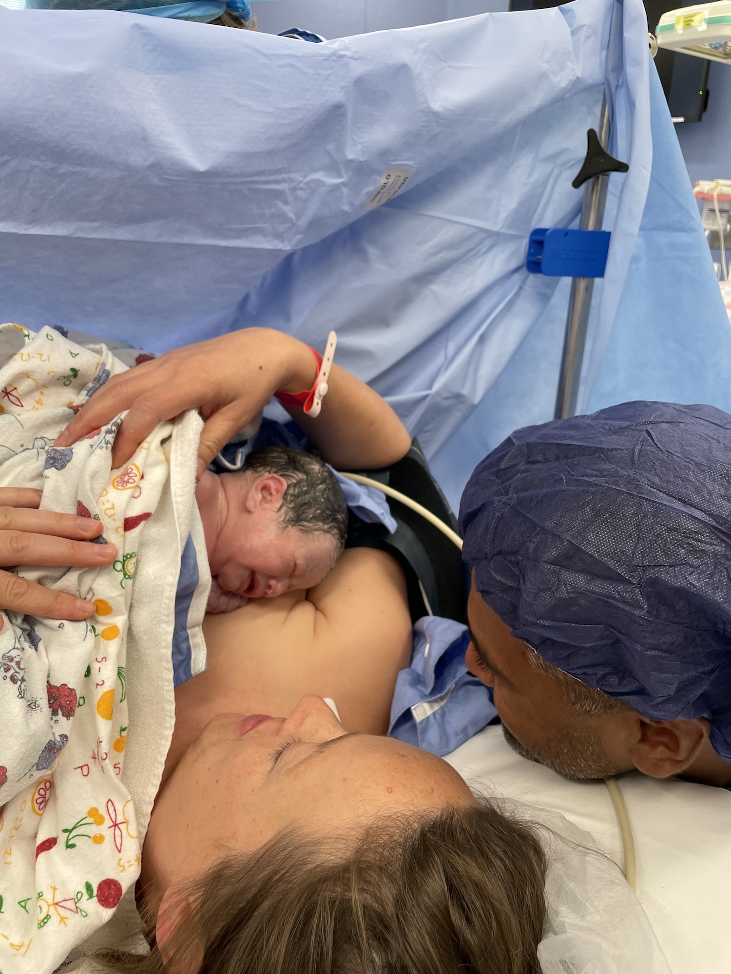 An IV was inserted, tests were done – I focused on S instead of the tightening cuff of the blood pressure machine – white coat syndrome a recent acquaintance during this pregnancy. Without warning, a small but mighty cry commanded the space. The cry of a tiny human, their first sound, testing their lungs, confused at the feeling of cold on their skin. My heart swelled.