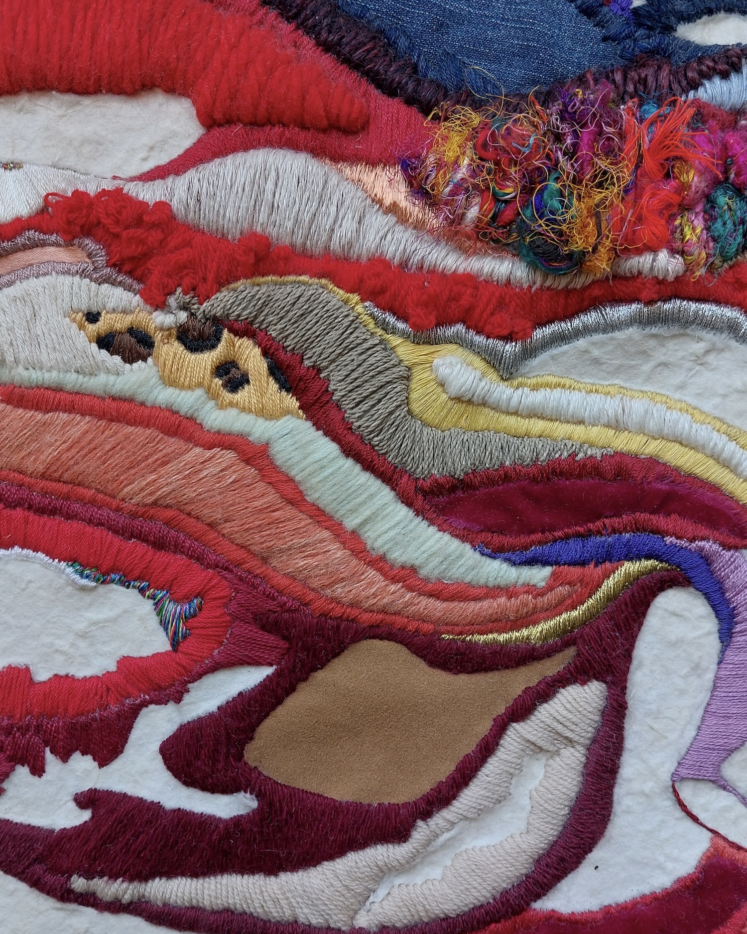 In these works, the chosen materials—such as intertwined threads, fabrics, and simple tools—become symbols of deep connections, often represented by long weaves or knots that evoke invisible bonds between body, mind, and society.