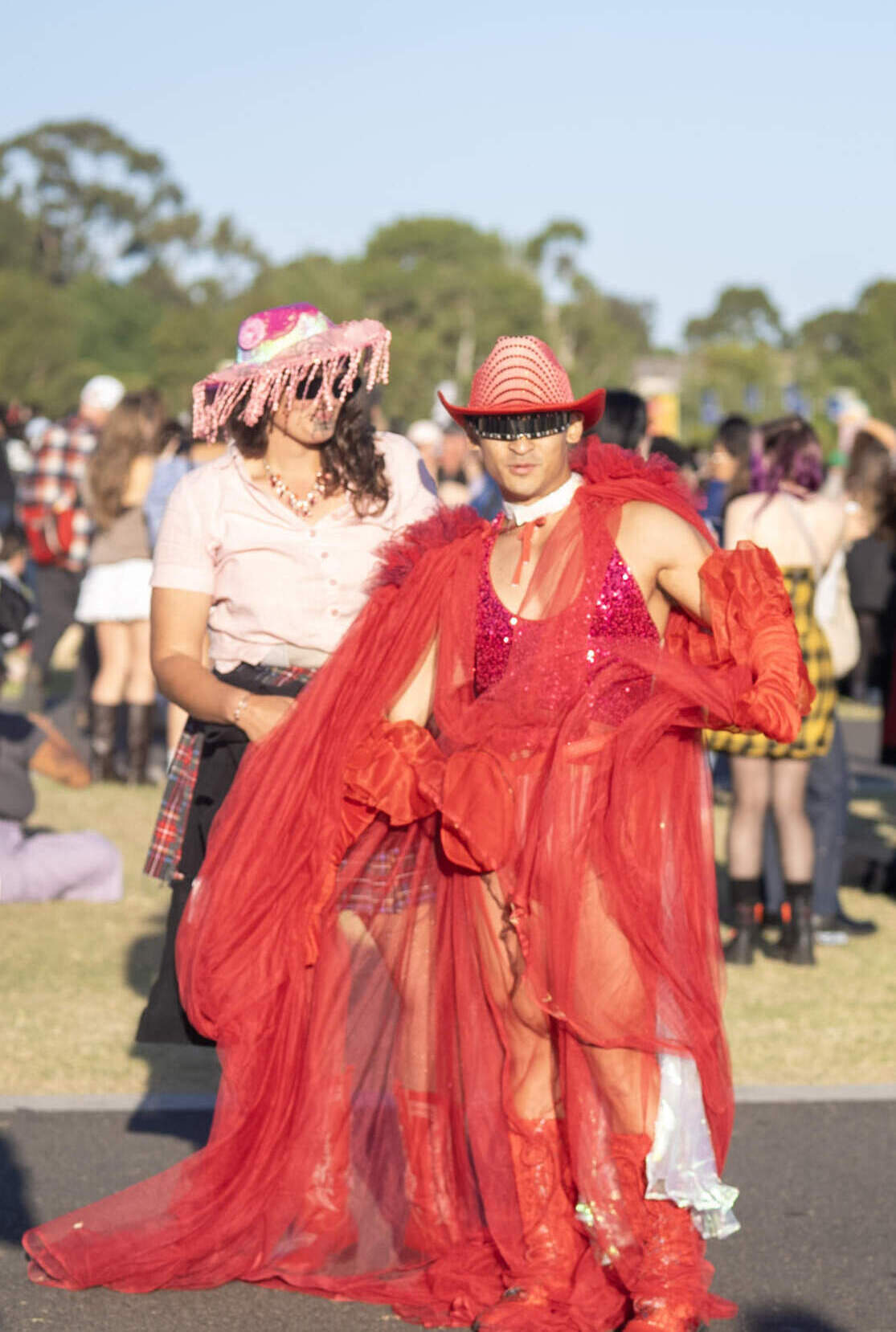 On a sunny 21 degree Melbourne day at Flemington Racecourse, Laneway Festival spread across the grass like a sunlit catwalk, far from its scrappy 2005 indie beginnings. By early afternoon, the grounds were shining. Sequins caught the sun, sunglasses perched low, ‘clean-girl’ slicked-back buns held firm and cowboy boots ruled the field. Bright pink sliced through Melbourne’s classic black aesthetic like a highlighter across a textbook page. Pleated plaid, denim miniskirts and micro shorts flashed past bralettes layered with sheer mesh tops. Graphic baby tees, cinched belts and playful textures created a kaleidoscope of festival fashion.